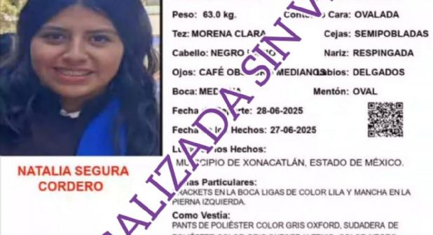 En contexto Tras cuatro días de búsqueda, la adolescente Natalia Segura Cordero, de 14 años, fue encontrada sin vida sobre una zona montañosa del barrio La Rosa, en el municipio de Otzolotepec, en el Estado de México.