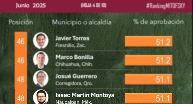 Naucalpan. - El “Ranking 150 presidentes y presidentas municipales de México” realizado por Mitofsky, correspondiente al bimestre de mayo-junio 2025, ubica en el puesto 48, al presidente municipal, Isaac Montoya Márquez, con un considerable incremento en la aprobación y con una diferencia de 94 posiciones con respecto a la última medición de su predecesora.