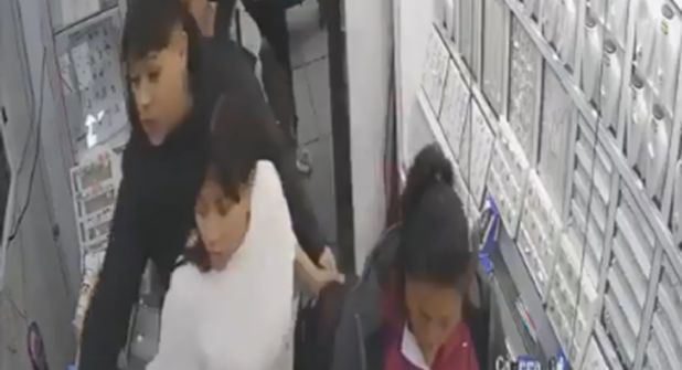 Las imágenes captan el momento en que clientes, empleados y un guardia se tiran al piso. Mientras uno de los hombres vigila, sus acompañantes toman alhajas, relojes y exhibidores. La acción se desarrolla a las 18:18 horas, según el registro de la cámara.