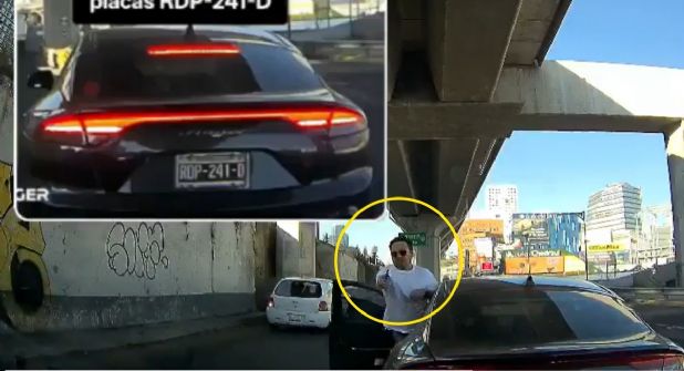 Un sujeto que conducía un vehículo con placas del estado de Morelos fue captado en un video en el momento en que le cierra el paso al conductor de una camioneta en Santa Fe, Ciudad de México. Luego, el coche se detiene, el hombre desciende del auto y hace el amago de detonar un arma de fuego.
