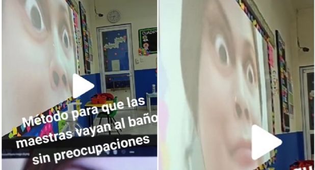 En el video se puede apreciar que la maestra abre una fotografía de ella en la computadora que tiene un proyector, y para impedir que sus alumnos se muevan de su lugar, hace zoom hasta uno de sus ojos para simular que los está observando mientras va al baño.