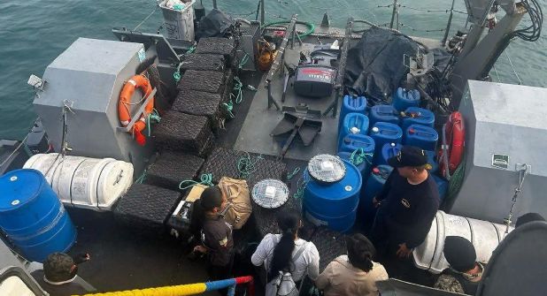 A los detenidos se les encontró, además de la droga contenida en 1,500 bloques tipo ladrillo, un teléfono satelital, 26 bidones de combustible y dos radio boyas.