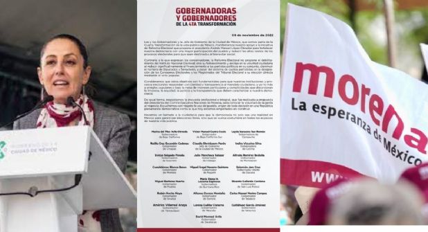 Los 21 gobernadores de Morena y la jefa de gobierno de la Ciudad de México firmaron un desplegado este miércoles en apoyo a la reforma electoral propuesta por el presidente Andrés Manuel López Obrador. La justificación de los titulares de los poderes ejecutivos en las entidades federativas es que se debe reducir significativamente el financiamiento para gastos de partidos políticos, además de una mayor participación del pueblo y la reducción del costo de los procesos electorales.