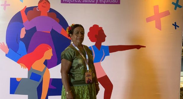 Vistiendo un vestido bordado color verde y con pequeñas flores del lado derecho de su cabello, Doña Juanita subió orgullosa de su labor al escenario del Roche Press Day en el que este año se habló de “Mujeres, salud y equidad”, con el objetivo de generar cambios y soluciones para mejorar el acceso a la salud para las mujeres de América Latina.