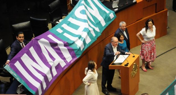 Fueron los senadores del PAN, específicamente, quienes llenaron el salón de sesiones de pancartas y luego tomaron la tribuna, en medio de reclamos de los senadores de Morena. Luego de la toma de la tribuna, el presidente de la Mesa Directiva, Alejandro Armenta, decretó un receso en la sesión ordinaria que se llevaba a cabo este martes.