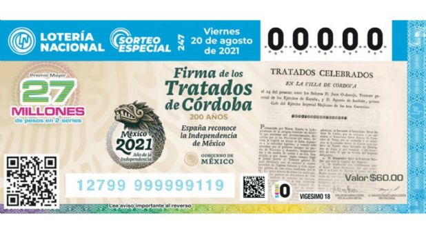 CÓRDOBA, VER.- Con un premio mayor de 27 millones de pesos que jugará el día 20 de agosto, la Lotería Nacional presentó el billete conmemorativo del bicentenario de la firma de los Tratados de Córdoba.