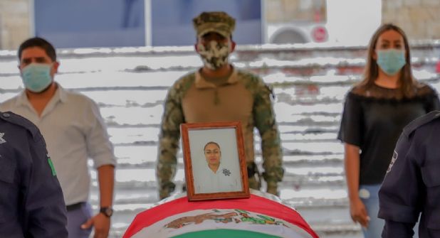 Con una bandera y una fotografía de ella sobre su ataúd, el director de Protección Ciudadana y Movilidad, Capitán de Marina, Enrique Morales Tolentino, dedicó unas palabras a sus familiares, entre los que se encontraban la madre y el hijo de María del Rosario.