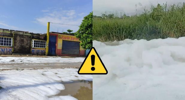 COATZACOALCOS, VER.- La mañana de este martes 6 de agosto, pobladores de Villa Allende, perteneciente al municipio de Coatzacoalcos al sur de Veracruz, fueron sorprendidos por la presencia de grandes cantidades de espuma blanca, generando temor e incertidumbre, ya que desconocen si se trata de algún producto químico procedente de la zona industrial.