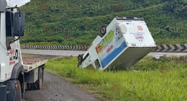 MALTRATA, VER.- La tarde del miércoles 22 de octubre, durante las intensas lluvias registradas en las últimas horas, una camioneta propiedad de la empresa Bimbo volcó, generando una intensa movilización de los cuerpos de emergencia y seguridad para atender la situación, no se reportan personas lesionadas de gravedad, solo daños materiales importantes.