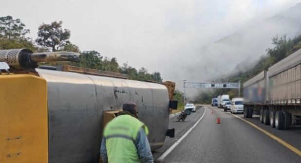 MALTRATA, VER. - Tome sus precauciones al circular sobre la autopista Puebla-Orizaba dirección Veracruz, debido al cierre parcial de circulación esto causado por un fuerte accidente ocurrido durante la tarde de este sábado 22 de febrero, en el que un camión tipo Torton acoplado a un auto tanque sufrió una volcadura, ocupando el carril de baja velocidad.