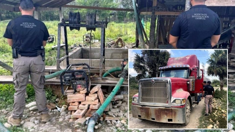 Durante el operativo, los agentes localizaron un tractocamión conectado a un tanque cilíndrico con capacidad para 30 mil litros, así como dos bombas hidráulicas y cuatro mangueras de alta presión de distintas longitudes.