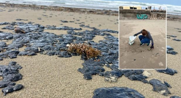 Los residuos de petróleo crudo, procedentes de alta mar, ya están a lo largo de la playa en las primeras etapas del malecón costero, donde hay una mayor afluencia de personas.