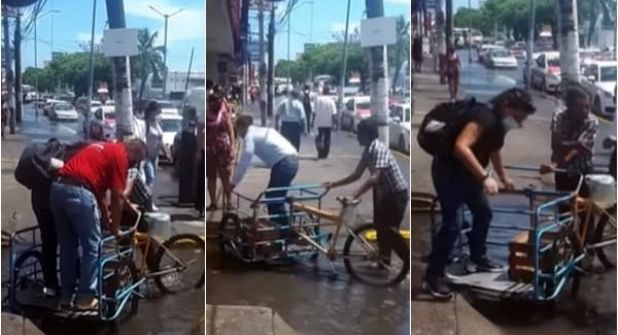 #VIDEO Un hombre con triciclo se convirtió en héroe de los peatones, cuando ofreció sus servicios para cruzar personas a través de una calle inundada, tras las lluvias en Veracruz.#mb pic.twitter.com/znz6ywYksu