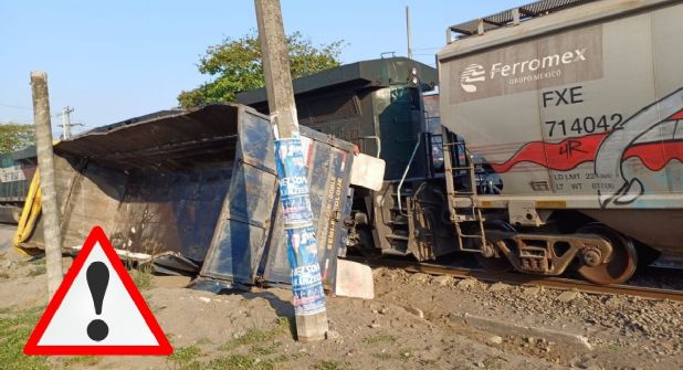 VERACRUZ, VER.- Un tráiler que intentó ganarle el paso al tren en el tramo de la Ciudad Industrial que cruza sobre la carretera libre federal Veracruz - Xalapa, en la localidad de Tejería, fue arrastrado por la locomotora por varios metros la mañana de este viernes 23 de febrero del 2024.
