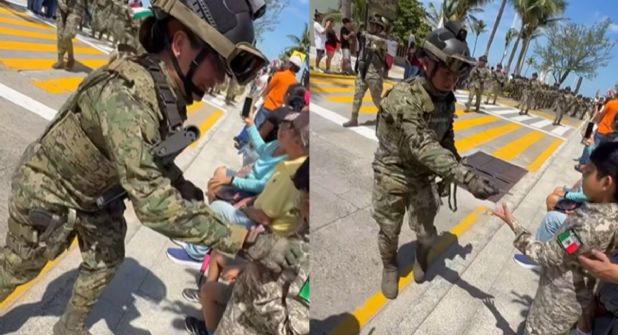En el trayecto, un primer elemento de la Marina rompió su formación para acercarse al niño y entregarle uno de sus parches. El niño, emocionado, solo sonrió.