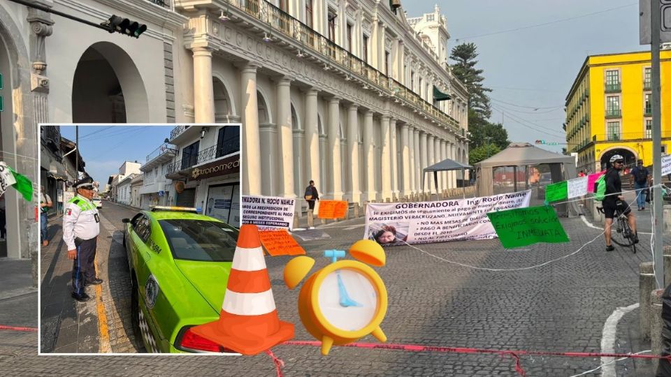 XALAPA, VER.- Tres tramos de calles del centro de Xalapa cumplen 24 horas cerradas este viernes 16 de mayo. Un plantón de personas jubiladas frente al Palacio de Gobierno llevó a la Dirección de Tránsito a tomar acciones para la coodinación del flujo vehicular,