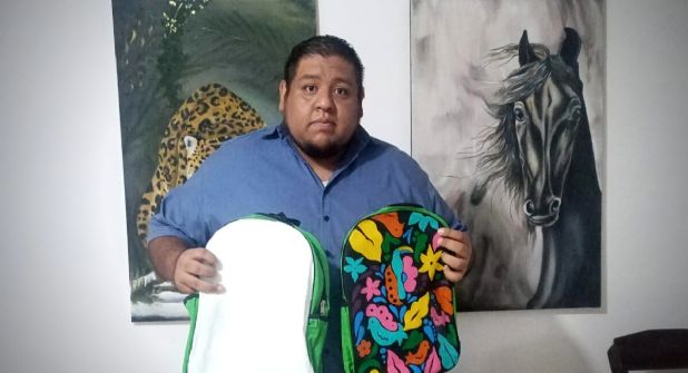 Una mochila color verde con estampado de flores y un tucán que resalta entre el diseño, fue el trabajo que hizo que miles de personas voltearan a ver las obras del artista jarocho Ulises Cruz Temix.