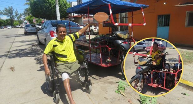 COATZACOALCOS, VER. –Iván Manzano de 55 años no se deja vencer ante las adversidades, hace 23 años la vida le puso uno de los mayores retos al perder sus piernas. Hoy realiza mandados en un medio de transporte que diseñó con una motocicleta, un triciclo y una silla de ruedas.
