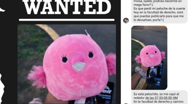 Una usuaria de redes sociales identificada como XL llegó al primer día de clases en la Facultad de Derecho de la UV acompañada de su tierno peluche, lo que sería el inicio de un buen semestre se convirtió en un día triste, pues tras la primera hora de clases, perdió de vista a flamingo.