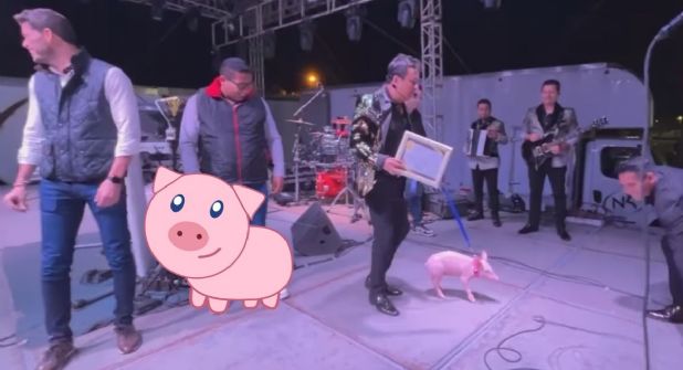 También, publicó el vídeo del momento en el que le dan a la puerquita como su nueva mascota, mientras él la agarra con una correa. “La Chabela” sacó unas risas en el baile en Dos Lomas, ya que mientras Nelson Kanzela daba las gracias, la pequeña puerquita comenzó a morder uno de los cables del micrófono.