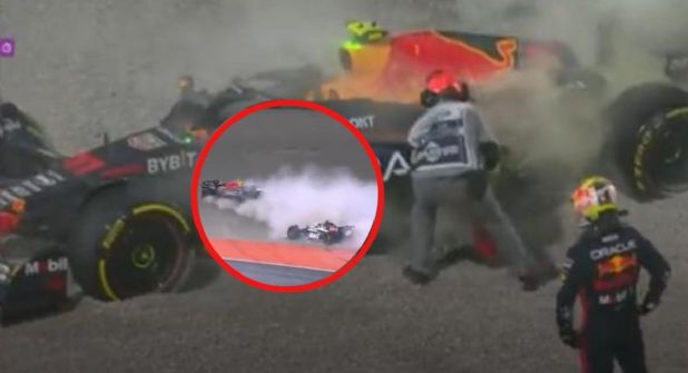 Tras el contacto entre Ocón y Hulkenberg, este último se llevó a Checo de por medio mostrando un brutal choque y el auto RB19 de Checo sufrió terribles daños, por lo que tuvieron que abandonar la carrera ambos.