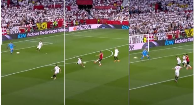 Al minuto 7 del encuentro, apenas adentrándose en el partido y con el marcador en 0, el Sevilla presionó la salida del conjunto de Manchester, quienes pese a ello decidieron optar por salir jugando desde la portería, por ello Maguire intentó tocar el balón hacia la banda tras recibir el pase de De Gea.