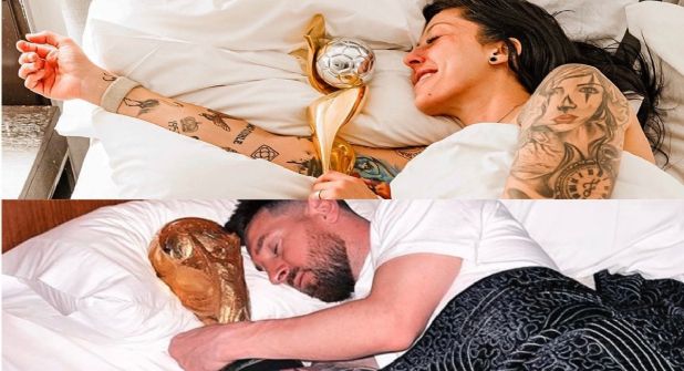 La foto de Jenni Hermoso al estilo de Messi, donde aparece la jugadora durmiendo con el trofeo, tras ser campeona del mundo con la siguiente frase “El sueño perfecto se hizo realidad”.