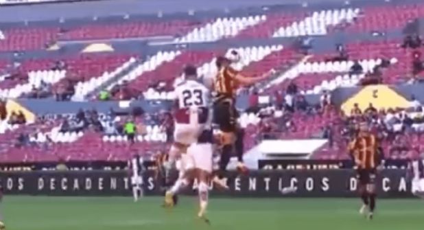 Pero el choque no fue entre algún rojinegro y el azulgrana, sino entre los actuales campeones, que intentaron rematarla de cabeza.