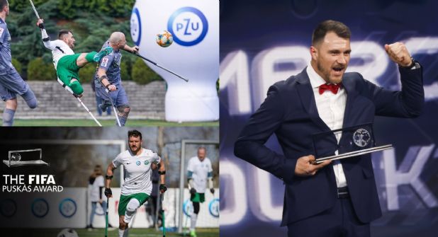 Marcin Oleksy es el primer futbolista que gana el premio Puskas tras marcar el gol con muletas, una recompensa para un futbolista que perdió su pierna luego de que le cayera una máquina encima.