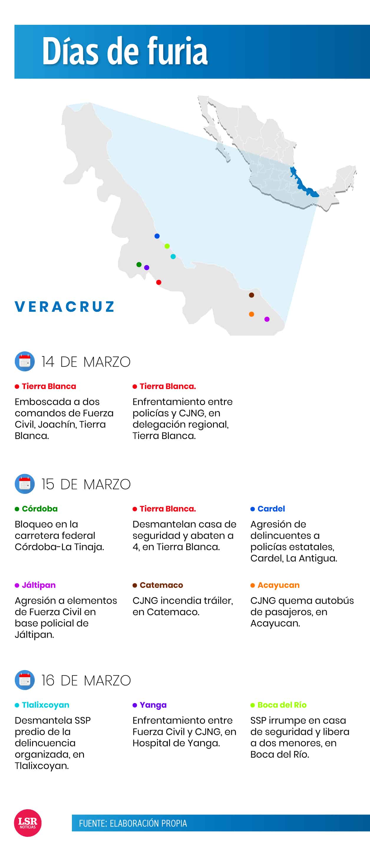 XALAPA, VER. – Veracruz vivió 72 horas de terror en nueve municipios de su territorio. Carreteras federales, hospitales y comandancias policiales albergaron 11 choques entre integrantes del Cartel de Jalisco y el gobierno estatal que dejó como saldo cinco personas muertas.