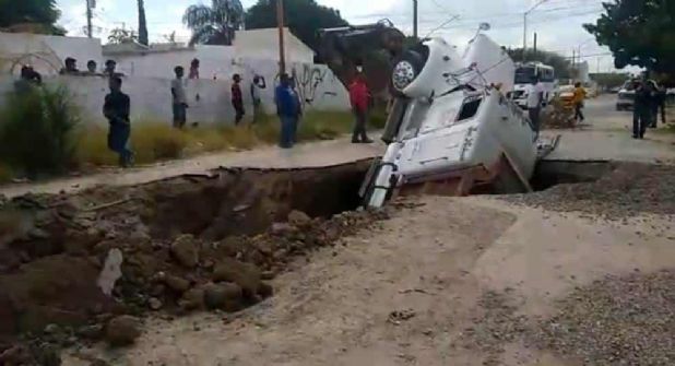 Esta tarde se reportó la caída de un camión de carga en un enorme socavón que se generó en Ciudad Nazas, entre las calles Paseo del Cerro y Cerro del Coli. pic.twitter.com/vlWLZt2bvx