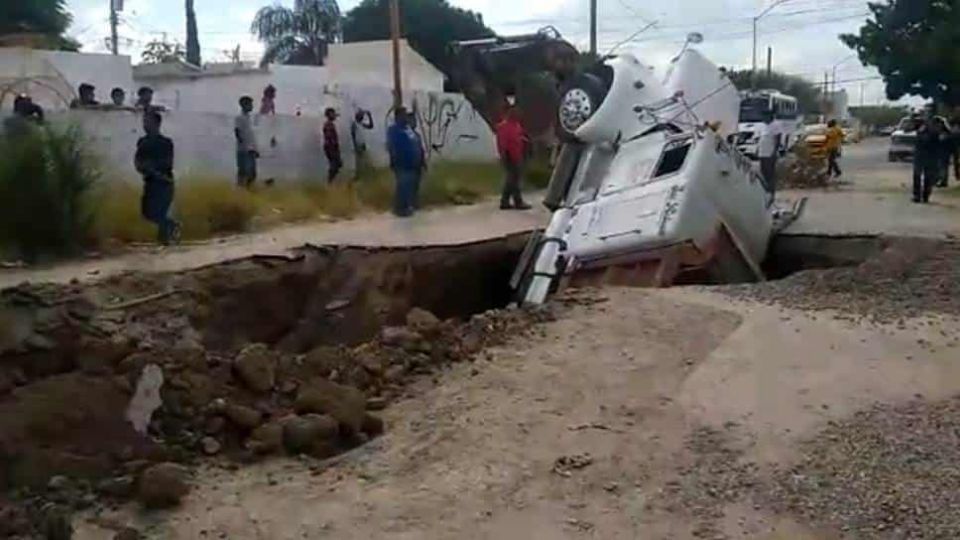 Al dar marcha hacia atrás repentinamente la carretera se abrió y generó un hundimiento de la tierra. La cabina quedó hacia arriba, lo que permitió que el conductor lograra salir por su propio pie.