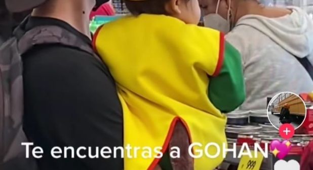 Gohan es uno de los hijos de Goku, lo sabrás si eres fan de dicho anime japones, y algo distintivo de este personaje es su llamativa vestimenta que usaba cuando era pequeño, un traje de color verde y amarillo con detalles en rojo, y como complemento un sombrero con una esfera roja en la punta lo que asemeja una "esfera del dragón", y una cola de mono que caracteriza a los sayayín según la afamada serie animada, situación que favoreció al niño del supermercado ya que el disfraz le quedaba a la perfección.