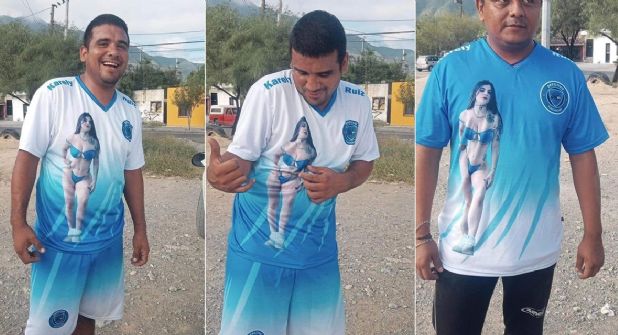 Con un uniforme de color azul y blanco, este equipo de fútbol usa una de las candentes imágenes de Karely Ruiz en su playera para motivarse en cada juego.