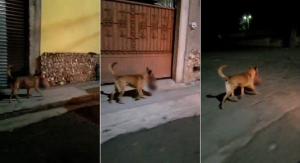 En el video de 42 segundos se aprecia a un perro caminando con la cabeza humana de un hombre, que al parecer lo trae de la lengua. Unos automovilistas son quienes graban el hecho.