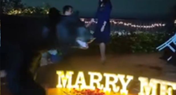En el vídeo se puede observar a una pareja vestida de forma elegante, a él con un traje formal azul, y a ella con un vestido largo de gala azul, en la terraza de un restaurante decorada con pétalos de rosa y un letrero de luces con el mensaje “Marry Me”.