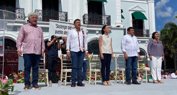 La “corcholata” de Morena a la presidencia de México, recibió el respaldo y ovación pública en Plaza de Armas, por miles de morenistas convocados el grupo político del director general del Fondo Nacional de Fomento al Turismo (Fonatur) y responsable del proyecto del Tren Maya, Javier May Rodríguez.