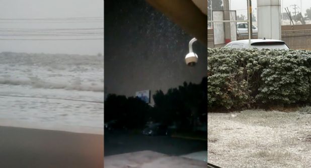En uno de los videos, se ve la caída de agua nieve en el Libramiento Oscar Flores Tapia, justo en los límites de los municipios de Saltillo y Ramos Arizpe, ya citados en el norte del país.