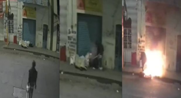 En la grabación de 26 segundos subida a las redes sociales se ve a un hombre delgado, con sudadera negra, tenis blancos y al parecer pantalón de mezclilla junto al “indigente”.
