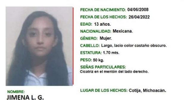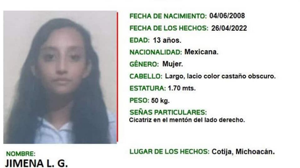 Los padres de Jimena L. informaron que su hija salió de su casa ubicada en la colonia Barrio Fuerte en Cotija, la noche del pasado 26 de abril, cerca de las 22:00 horas.