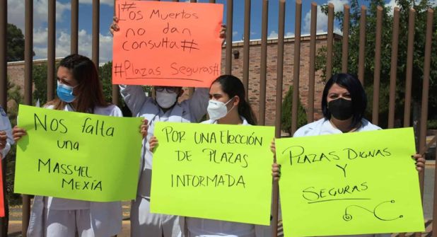 {"quote":"\"Nos falta una, Masiel Mexía\", \"Los muertos no dan consulta\" y \"Plazas dignas y seguras\", fueron los mensajes en las pancartas que portaban."}