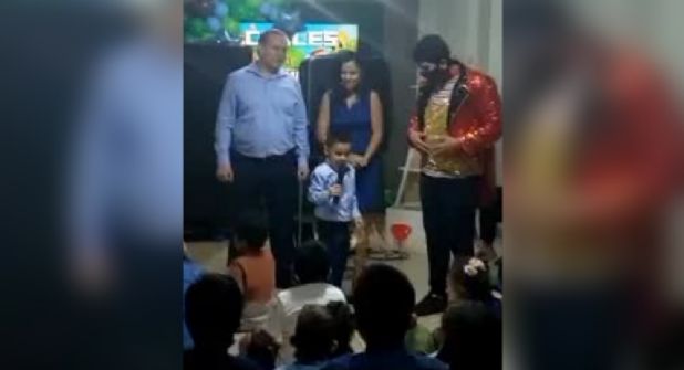 Acompañado de sus padres y el payasito de la fiesta, el niño dijo: “Buenas noches, gracias por venir a mi cumpleaños. Me siento feliz de que todos estén aquí”.