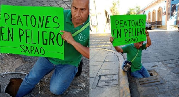 De acuerdo con el cálculo de Manuel Núñez, son al menos cien coladeras sin tapa o dañadas que representan un peligro constante para la ciudadanía oaxaqueña, por ello decidió hacer una denuncia muy gráfica de cómo las personas se pueden lesionar.