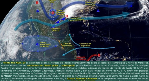 Durante esta noche y la madrugada del miércoles, el Frente Frío Número 27 se extenderá sobre el noreste de México y avanzará por el litoral de Tamaulipas y norte de Veracruz.