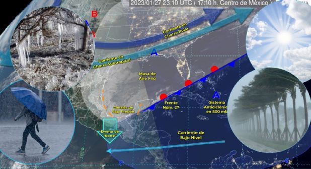 Durante el transcurso de la noche de este viernes 27 y madrugada del sábado 28 de enero, el Servicio Meteorológico Nacional prevé lluvias muy fuertes a intensas que podrían ocasionar graves repercusiones en el sureste del territorio nacional. Así mismo, el evento de norte afectará al istmo y golfo de Tehuantepec.