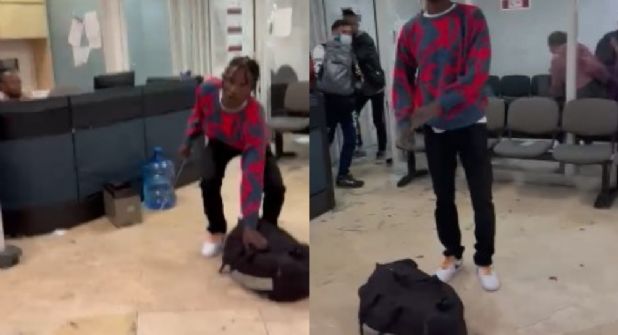 En el video se observa al joven con una maleta, él es empujado por uno de los colaboradores de INM, en la oficina se pueden ver vidrios rotos, regados en la sala de inspecciones. El joven tomó uno de los vidrios más grandes que estaban tirados en el suelo y amenaza al personal como si fuera a apuñalarlos, hasta que logra salir de la oficina de migración.