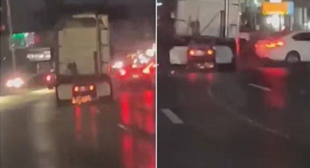 En la grabación compartida en redes sociales se puede ver como la parte trasera del tráiler comenzó arrastrase sobre el pavimento mojado para posteriormente sacar chispas sobre el asfalto en avenida Cruz del Sur, por donde continuó su alocada carrera.