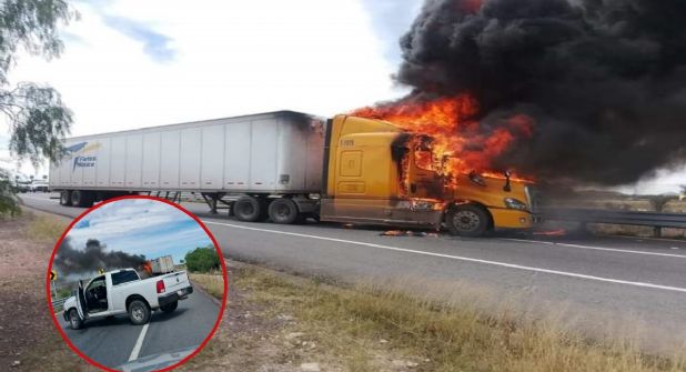 En videos y fotos compartidas en redes sociales se puede ver a un tráiler amarillo con la leyenda “Fletes México” que se encuentra ardiendo en llamas del tractocamión.