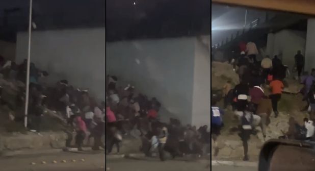 Los migrantes atravesaron corriendo la avenida Internacional que corre junto al cerco fronterizo para llegar hasta el borde de la canalización del Río Tijuana que desemboca en suelo norteamericano.