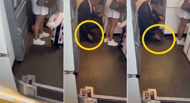 En el video se observa que el sobrecargo finge acomodar algunos artículos en el último cajón de un estante, pero no suelta su celular que lo mantiene sobre el suelo apuntando la cámara debajo de la falda cuando una pasajera ingresa a la aeronave.